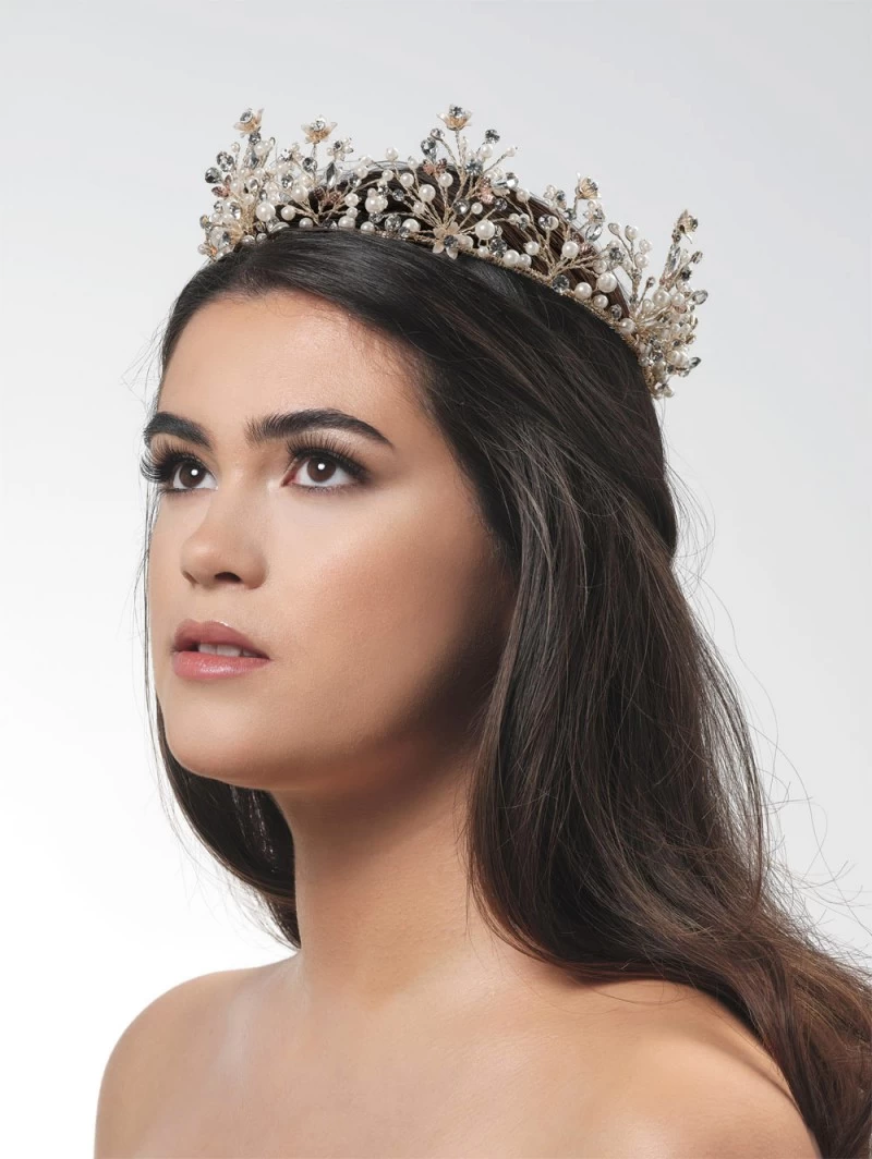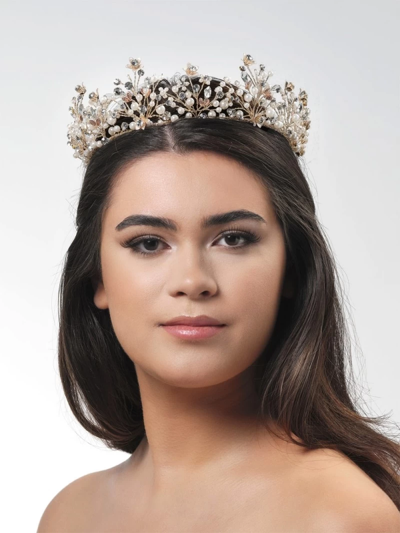 Details: Goudkleurige kroon, roségoudkleurige blaadjes, goudkleurige bloemetjes, ivoorkleur parels, strassteentjes