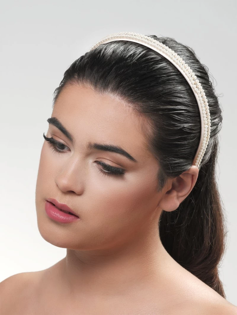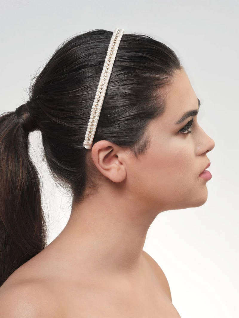 Details: Ivoor- en goudkleurige tiara met een combinatie van parels aan de zijkanten en strass steentjes in het midden