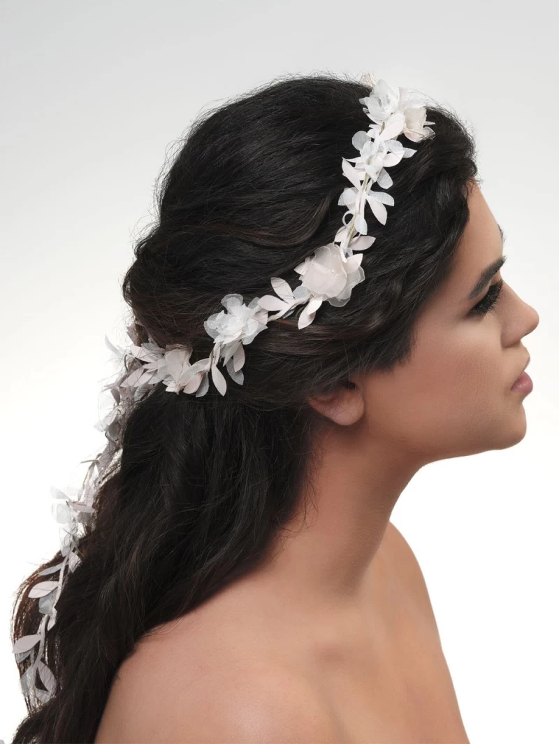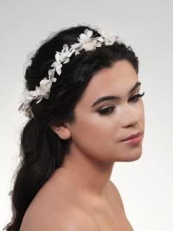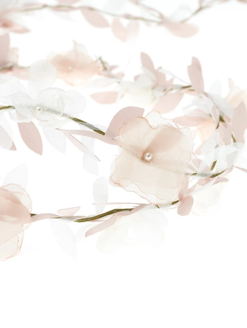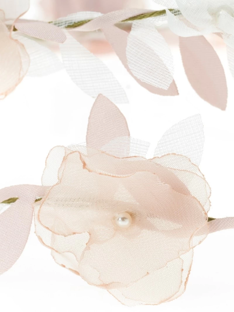 Details: Ivoor en blushkleurige flexibele organza haarband met een rijtje organza bloemen en bladeren