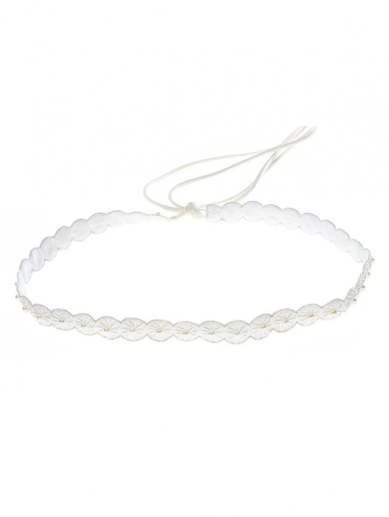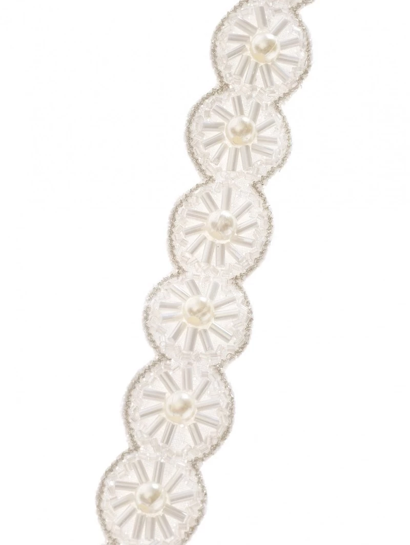Materiaal: Ivoorkleurige stoffen cirkelvormen, versiering van ivoorkleurige kraaltjes en ivoorkleurige parels