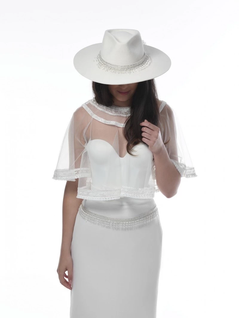 Materiaal: Ivoorkleurige stoffen ceintuur, franjepatroon van ivoor- en zilverkleurige kraaltjes