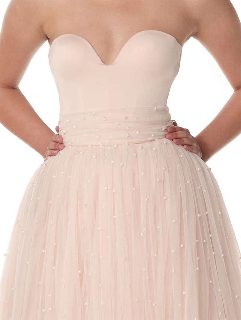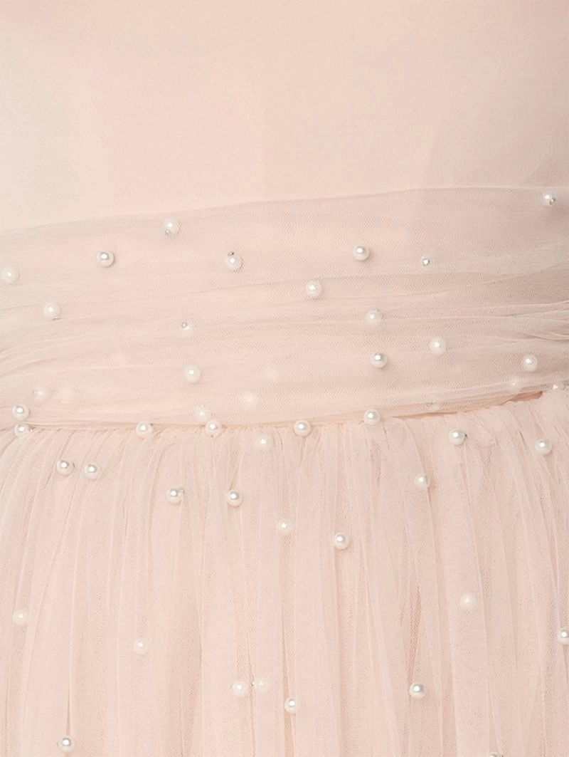 Details: blushkleurige riem van sluiertulle, ivoorkleurige parels