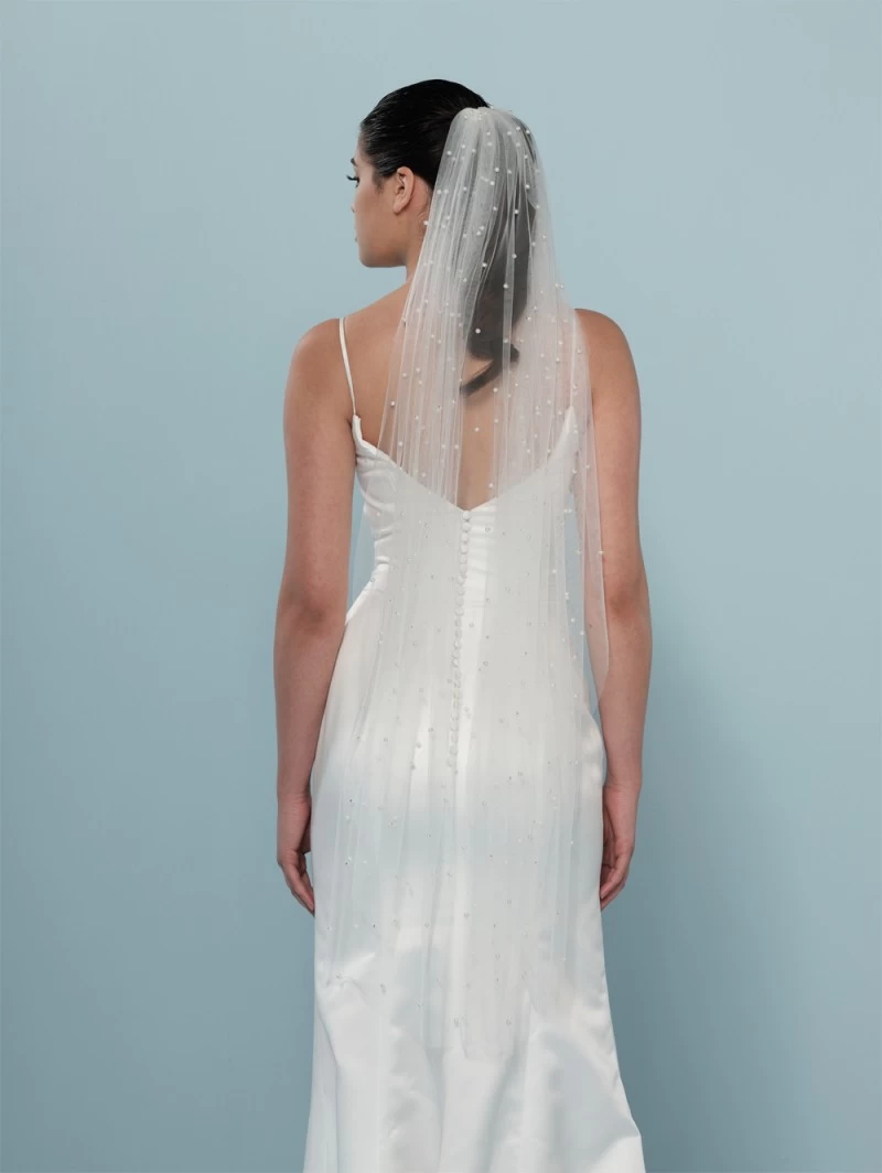 Details: ivoorkleurige soft-tule-sluier versierd met ivoorkleurige parels