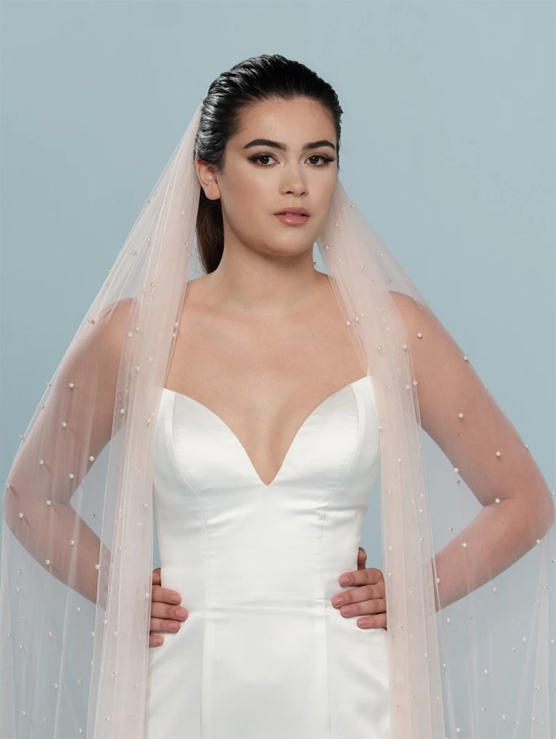 Details: blushkleurige soft-tule-sluier versierd met ivoorkleurige parels