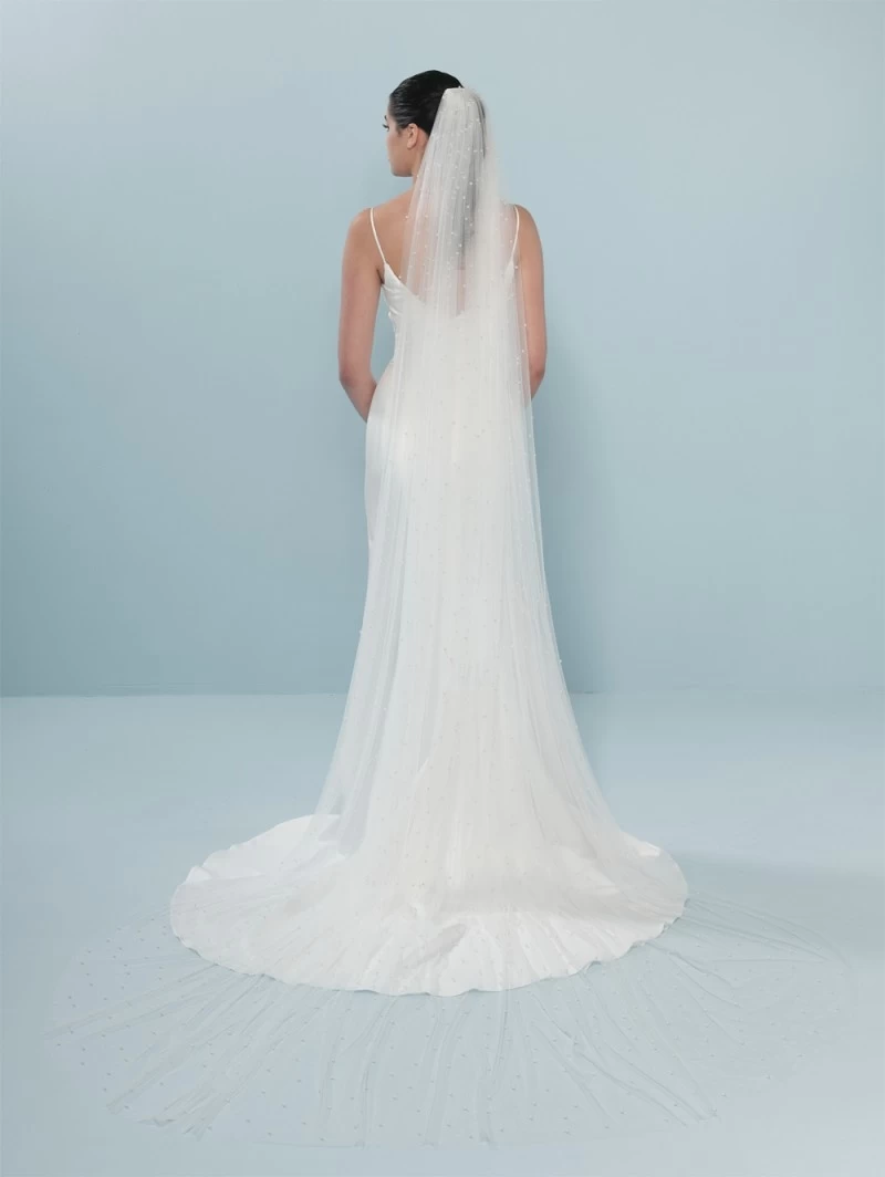 Details: ivoorkleurige soft-tule-sluier versierd met ivoorkleurige parelsÂ