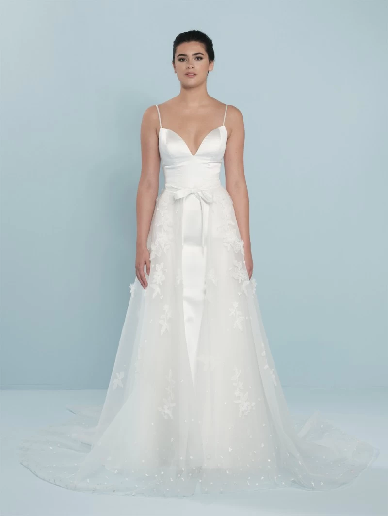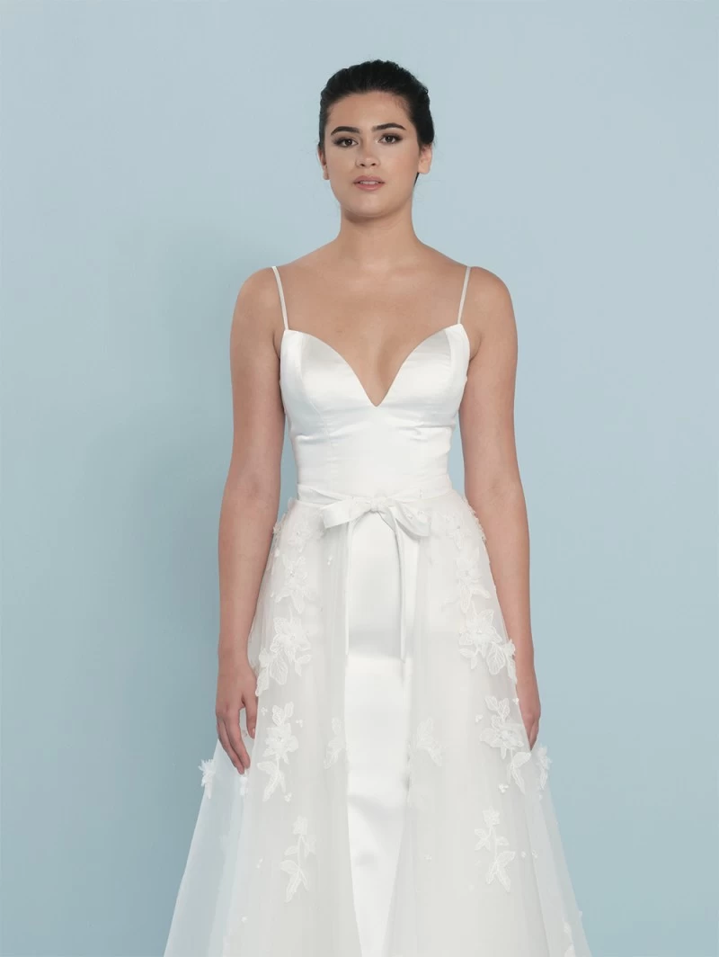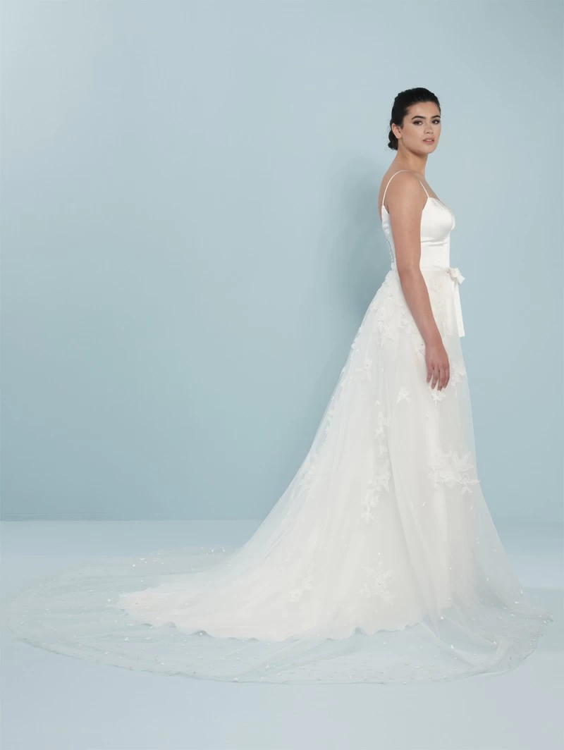 Details: soft-tule, kant, 3D-bloemen, geborduurde stippen; overrok met strik- of haaksluiting in het midden van de voorkant