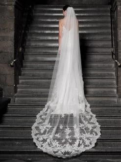Prachtige enkellaags sluier in medium tule van Poirier. De sluier is versierd met geborduurde bloemversieringen en pailletten.
