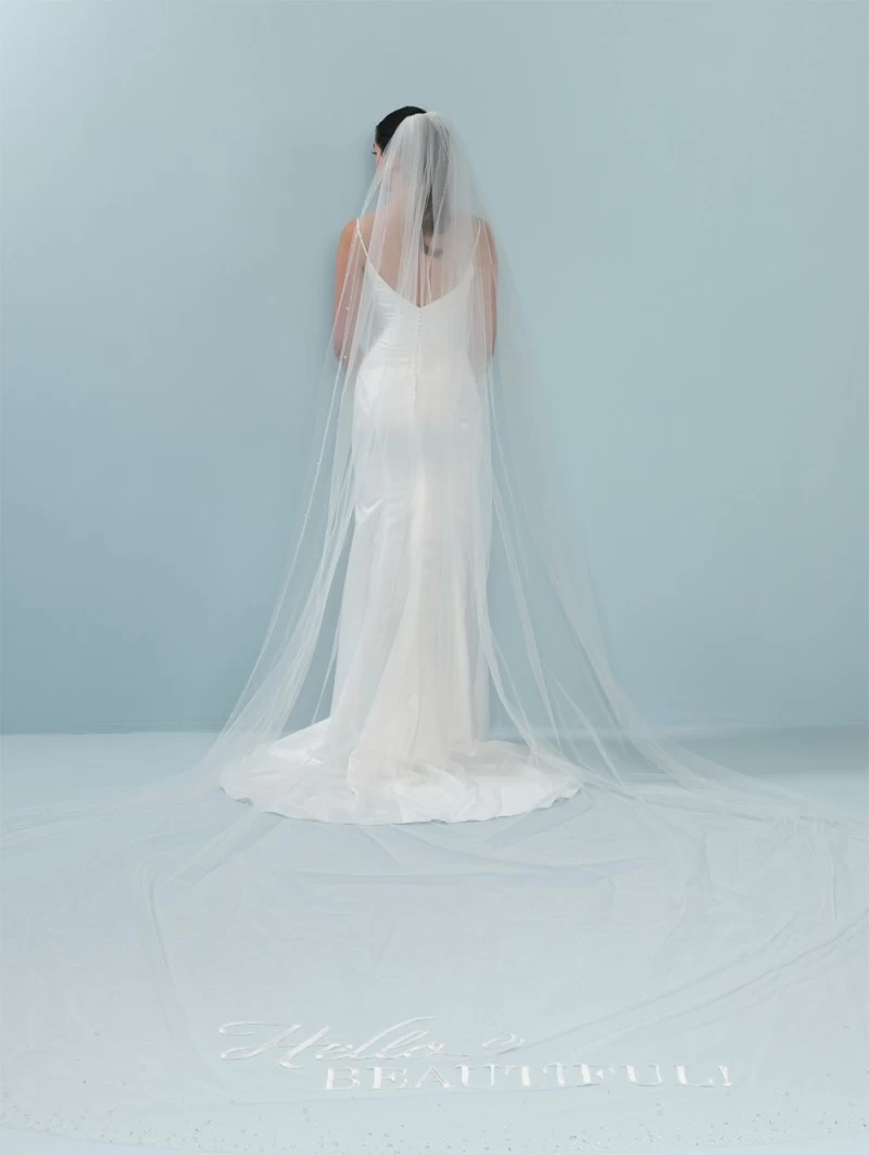 Details: sluier met kristallen, pailletten en geborduurde tekst “Hallo Beautiful”.