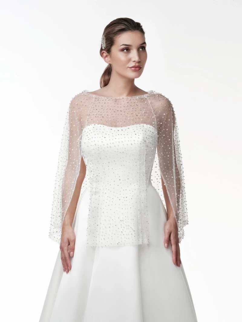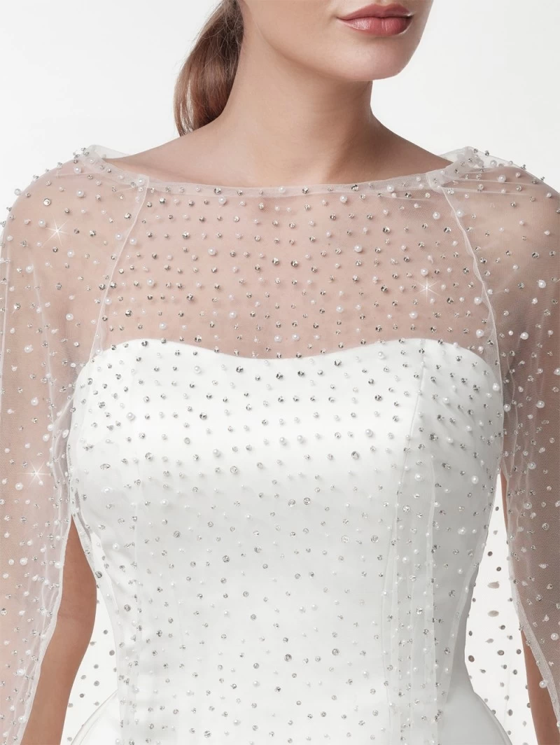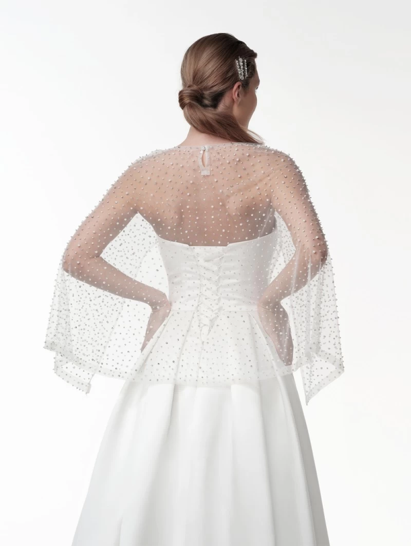 Details: ivoorkleurige cape van soft-tulle, met parels en strasssteentjes